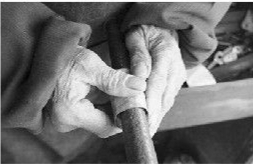 从尿桶里敲缸沙,简单一些。那层缸沙已经将尿桶的木板缝隙堵得严严实实,滴水不漏。缸沙敲得不好,尿桶容易渗漏,所以一般的人家不轻易敲缸沙。在粪缸和粪坑里敲缸沙,先要把所有的大小便挑走,人才能爬下去,把缸沙敲下来,其脏其臭,其烦其累,可以想见。