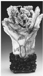 在中国的玉雕技法中,还有一项独具特色,即为“俏色”。有些玉料中带有一些杂色,弃之可惜,匠人们便以杂色部分的形与色为基础进行设计。清代玉雕《翡翠蝈蝈白菜》即采用了此类技法。白菜根部基本呈白色,而白菜的顶部及蝈蝈的形态运用玉的黄、绿之色表现,塑造出了白菜被霜冻之后的质感以及绿蝈蝈在食用白菜时的场面,极富自然妙趣。
