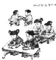 同学们手拿饭盒排队盛饭。一方面大家都想表现出能吃忆苦饭的无产阶级感情,另一方面中午时间大家早就饥肠辘辘了,又赶上免费午餐,也都恨不得多吃些,所以并不听老师在旁的提醒:“同学们,第一次先不要多盛,吃不够再盛。”
