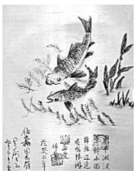 这首图文显然是我家乡那220平方公里的东平湖水阔深而水质优良,是他视察后欣然感到鱼虾肥美源于水中生态好而作。第三幅《双鳜图》题诗为:“鳜鱼凶猛斗精神,青草处处有蛙声,烹调美味君须记,姜蒜多放好去腥。”下面是落款:岛叟锦裳于癸已年。此3幅都加盖了他和夫人的双印。这3幅鱼作,都形象准确而富有动感,比许多专业画家所作鱼类图,看着还舒服可爱,毫无做作之感,天然质朴。这些水中精灵尾尾真如水中游来呢,有的就像在无边无际水中游来呢!