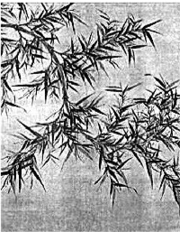 墨竹画法,一说始于唐代的吴道子,北宋黄庭坚说:“墨竹出于近世,不知其所师承。初吴道子作画……运笔作卷不加丹青,已极形似。”一说出自唐玄宗,元人张退公以为:“夫墨竹者,肇自明皇,后传萧悦,因观竹影而得意。”也有说始于王维,根据是他画于开元寺壁,现已失传的《抵园弟子像》。还有传说始于五代后唐名将郭崇韬之妻李氏。传说李夫人是郭崇韬的战利品,被俘后收为妻妾。她闷闷不乐,常以书画解闷。有一夜,她隔窗赏月,见窗纸上有婆娑竹影,越看越觉有趣,竟用笔墨就窗纸上摹写竹影,天亮后再看,竟是一幅墨竹图。这与唐玄宗“因观竹影而得意”如出一辙,都点明了墨竹画的两个特点,一是因竹影而得,也就是似是而非,别有意境;另一个就是墨写竹影,写此意境,开创了墨竹的技法。不管是谁始创墨竹画法,艺术史上都以文同为墨竹画宗祖。