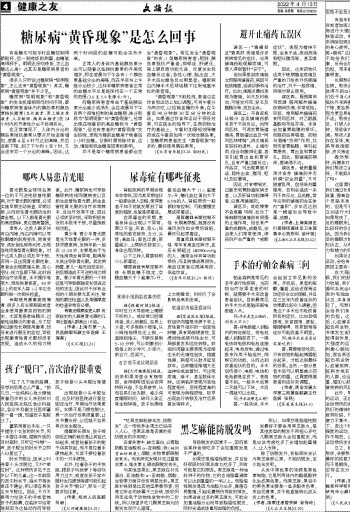 而糖尿病患者常由于基础胰岛素分泌减少或消失,会在凌晨与下午有两个很难控制的高血糖期,被分别称为“黎明现象”与“黄昏现象”。经常出现在晚餐前的高血糖称为“黄昏现象”,但也有患者的“黄昏现象”发生较晚,表现为睡前血糖高于晚餐后2小时血糖。诊断时需排除饮食、运动、情绪和低血糖等因素的影响。