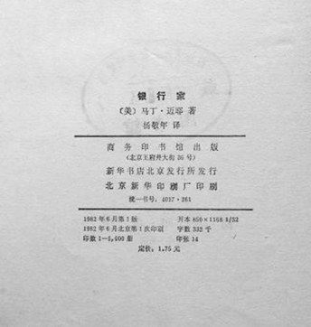 随后,商务印书馆又荐来第四本《银行家》,系里问我要不要翻译,我当时只是想多做些工作,并不计较报酬,所以仍然接受翻译,结果到1982年出版时,已经不仅能署上我的名字,而且还能与系里分成稿酬了。