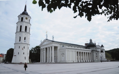 维尔纽斯大教堂所在之地,前基督教时期曾是古立陶宛人祭祀雷神泊昆纳斯的场所。基督教传入后,约14世纪末建起首座木构教堂。大公维陶塔斯时再建哥特式教堂。现在维尔纽斯大教堂的主体建筑,庄重典雅,以白色和米黄色为主调,前置一座高大的黑顶白壁八角形六层钟楼。同以往在西欧见过的许多天主教堂相比,维尔纽斯大教堂内外墙面和陈设的布置,讲求素雅,不尚奢华,乍看颇有些北欧新教建筑的风范。