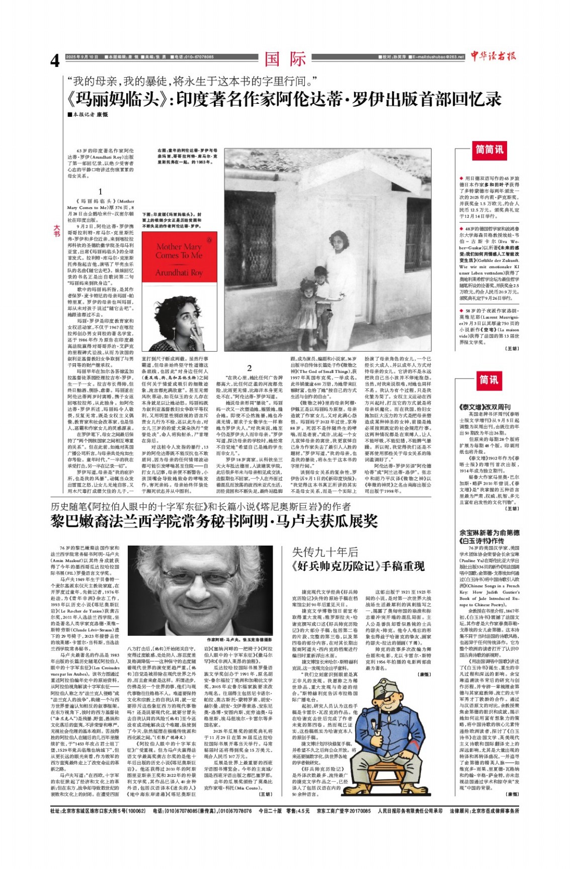 《微物之神》里的母亲阿穆·伊佩正是以玛丽妈为原型。母亲造就了作家女儿,又对此满心怨恨。玛丽妈于2022年过世,享寿88岁。死因不是伴随终生的哮喘,而是老衰。“或许,比起一个女儿哀悼母亲的离世,我更哀悼自己身为作家失去了最引人入胜的题材。”罗伊写道,“我的母亲,也是我的暴徒,将永生于这本书的字里行间。”