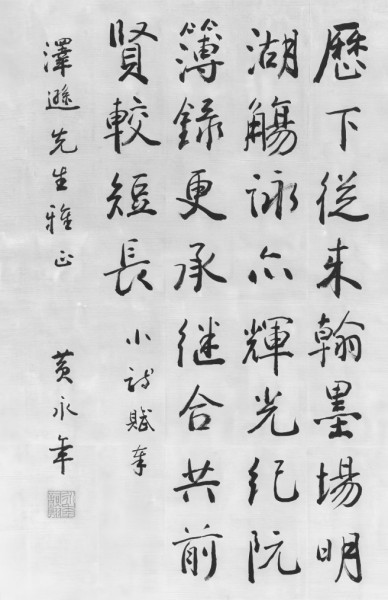 我还写信给黄先生要了一幅字,理由是搬了新家(山大第五宿舍二号楼)。黄先生很慷慨地作了一首诗,写成条幅带来了。内容过录如下:“历下从来翰墨场,明湖觞咏亦辉光。纪阮簿录更承继,合共前贤较短长。小诗赋奉泽逊先生雅正。黄永年。”下钤“永年词翰”朱文方印。时间当然是2001年3月。