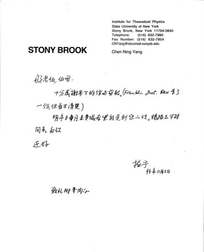 1966年,杨振宁先生离开普林斯顿,前往纽约州立大学石溪分校,创立理论物理研究所。虽相隔更远,但他仍抽时间到费城看望我祖父。1994年11月2日,他在“理论物理研究所”的信笺上写下:顾老伯、伯母: