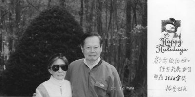 杨振宁虽早已名满天下,但对我祖父的科学成就仍然十分敬重。2000年初,他寄来一张印有他与夫人杜致礼合影的贺卡,写道:“顾老伯、伯母: