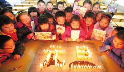 ①2009年12月31日,浙江省舟山市定海区海山小学学生用点燃的蜡烛拼成“元旦”字样,喜迎新年。②2009年12月31日晚,绚丽的焰火在青岛奥帆中心上空绽放,迎接即将到来的2010年。③2009年12月31日晚,中国长春瓦萨国际滑雪节“瓦萨之夜”新年晚会上,演员在演奏马头琴。(新华社发)