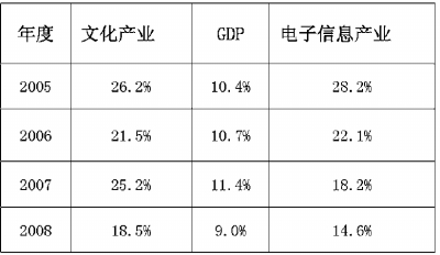 近年文化产业平均增长速度高达17%以上,比同期GDP增速高出10个百分点左右,不仅高于传统产业的增长速度,而且还高于同为朝阳产业的电子信息等产业的发展速度(见表一)。