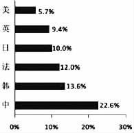 据联合国五大机构发布的《2008创意经济报告》数据显示,2005年中国创意产品出口额为613.6亿美元,成为全球创意产品的第一生产国和出口国。近年来核心文化产品出口的增长率也远远高于美、英、法、日、韩等国(见图二),版权贸易逆差状况得到逐步改善,2009年法兰克福书展中方输出版权达2417 项。