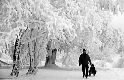 在德国阿尔滕贝格的厄尔士山上,一名男子拉着他的孙子在雪地上滑行。 (边易)