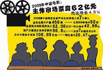 本报北京1月8日电(记者李春利、李蕾)2009年全年故事片产量达到456部,较2008年增长50部;全国城市的电影票房收入在2008年增幅30%的强势基础上,又增长42.96%,达到62.06亿元;全年电影综合效益106.65亿元———这是国家广电总局电影局今天在京公布的2009年中国电影产业发展数据。