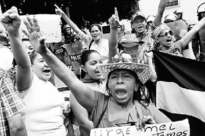 1月7日,在洪都拉斯首都特古西加尔巴,被罢免总统塞拉亚的支持者高喊口号,参加游行示威活动。当日,特古西加尔巴再次爆发大规模游行示威,数千名塞拉亚的追随者身穿印有塞拉亚名字的红衫,举着要求其复职的条幅,在市区主要街道上示威,要求严惩军事政变的参与者。洪都拉斯当选总统洛沃此前曾向议会提出对政变各方实施政治大赦的建议,希望以此化解困扰该国数月的政治危机。但被罢免总统塞拉亚坚持认为,军事政变的参与者应该“因叛国罪而受到法律的严惩”。 新华社发