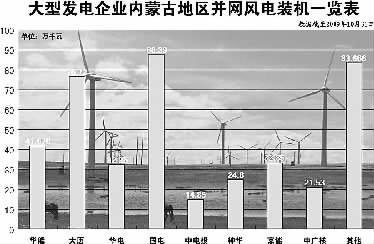 据了解,内蒙古风电总装机容量430万千万,目前居全国第一位。内蒙古电力公司计划处提供的资料显示,2007年以前,内蒙古的风电不到100万千万,本地消化不成问题。随着国家鼓励新能源发展和节能减排的需要,风电建设进入快速发展时期。这个过程出现了风电电源点建设速度较快,但送电通道建设严重滞后的不协调、不联动局面。内蒙古电网已尽最大努力接入和消纳风电,占到了最大供电负荷的27%,达到世界领先水平。但由于风电投产机组越来越多,内蒙古西部电网消纳风电的空间已经很小(内蒙古东部四盟市已划入国网公司)。现在夜间10点到凌晨7点,为了保证火电供热机组的运行,只能被迫让风电弃风停机。
