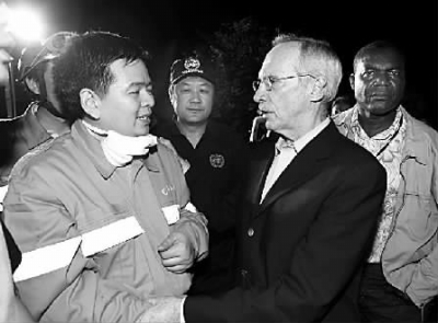1月14日,联合国秘书长助理埃德蒙·穆勒(右)在太子港视察灾情时与中国国际救援队领队黄建发交谈。穆勒感谢中国政府及时派出救援队到海地进行救援。新华社发