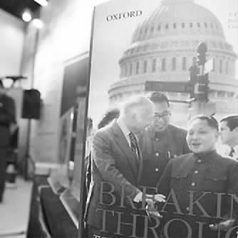 《突围》(英文版)一书的封面,取自1979年年初时任国务院副总理的邓小平同志访问美国的历史图片。在美国国会山前,邓小平同志与美国国会议员谈笑风生,他用坚毅的目光凝视远方,仿佛在展望中国当时刚刚开启的改革开放大业的远景。与《突围》海报并列张贴的是牛津大学出版社在世界上最负盛名的《牛津英语词典》的海报。牛津大学出版社市场部负责人杜普斯介绍说,《突围》是牛津大学出版社今年最重要的推荐图书,他们相信当代中国是全世界关注的热点,书展期间很多出版商主动登门来洽谈《突围》版权交易事宜。