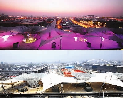 1月21日,上海将迎来世博会开幕倒计时100天。目前,世博园区场馆建设进入尾声,上海世博园区正在以崭新、完美的姿态迎接世博会的到来。上图:世博会倒计时100天之际拍摄的进行夜景灯光调试的世博中心和世博轴(2010年1月18日摄)。下图:世博会倒计时300天之际拍摄的世博中心和世博轴(2009年7月5日摄)。新华社发