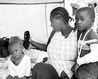 一月二十一日,在海地首都太子港的一个临时安置点中,一位母亲在照顾两个孩子。海地政府当日宣布,政府计划将四十万太子港地震灾民转移到郊外的临时住处。新华社发