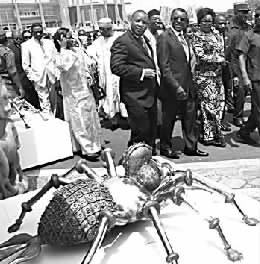 1月22日,在喀麦隆首都雅温得,参观者从一个非洲手工艺人制作的铜蜘蛛展品旁经过。当日,第二届喀麦隆国际手工业博览会在雅温得市政府广场开幕。除喀麦隆本土展商外,另有来自全球20多个国家和地区的机构和个人展商参展。新华社发