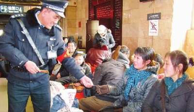 民警在太原火车站向广大旅客发放以“八要八不要”为内容的“民警温馨提示卡”,提示旅客安全注意事项,宣传“防盗、防抢、防骗”等旅行常识。随着春运来临,太原铁路公安局出台了一系列“便民利民”措施,在太原、大同、临汾等较大火车站设立了便民服务台,为旅客提供咨询、报警、求助、安全提示等服务,确保旅客安全、顺利回家。本报通讯员彭贵平、张卫勤、刘美生摄