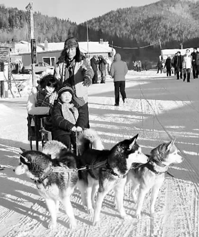 1月24日,游客在牡丹江大海林双峰林场内乘坐狗拉爬犁观光游览。2009年12月以来,素有“中国雪乡”之称的黑龙江省牡丹江市大海林双峰林场开始推行景区游客低碳游览计划,所有游客乘坐专用观光车辆进入景区,在景区内或徒步或乘坐马拉爬犁等游览,有效控制了景区内的机动车流量。 新华社发(张春祥摄)