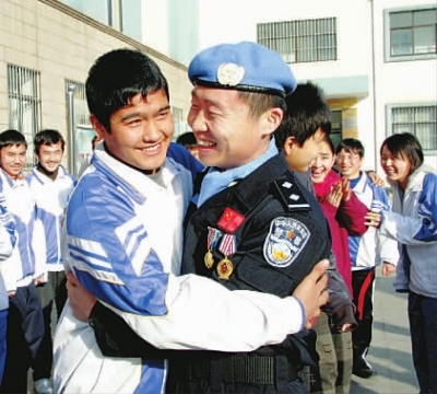 1月25日,山东省青岛市崂山二中举行了一场以主题“发扬维和精神立志建设边疆”为主题的英模报告会,青岛边防支队参加过中国第三次赴海地维和警察防暴队的邹建警官向师生们讲述了中国维和警察在海地艰苦环境中执行维和任务的苦辣酸甜。这是新疆班少数民族学生在报告会后同邹建叔叔热烈拥抱。 本报通讯员娄铭摄