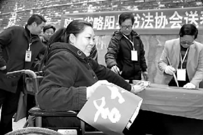 1月26日,陕西省略阳县书法家协会的书法家们冒着小雪来到该县何家沿镇和菜籽坝廉租房小区,开展送春联送书画下乡活动,丰富灾区群众的精神文化生活。菜籽坝廉租房小区是汶川地震后,陕南灾区第一个入住的廉租房小区,目前入住的都是在地震中受到影响最大、生活最为困难的群众。图为特困户、残疾人马新芬拿着刚领到的“新春大吉”楹联。
