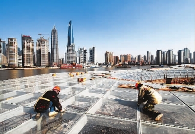 1月26日,工人在即将建成竣工的上海十六铺世博水门施工。近日,2010年上海世博会水上交通运行方案正式公布。世博会将设置7座世博水门,游客除陆路交通外,还可凭门票从世博水门通过客渡船进入园区。目前,世博水门陆续建成亮相,世博客渡船已投入试运行。新华社发