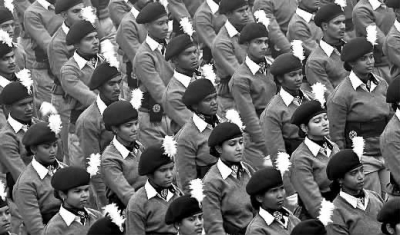 1月26日,在印度首都新德里,受阅女兵方队在阅兵式中行进。当日,一年一度的共和国日游行和阅兵在浓雾弥漫的新德里举行。新华社发
