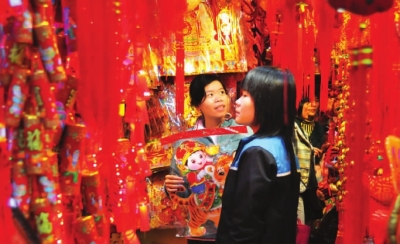 1月27日,海口市民在选购年货。春节临近,海南省海口市博爱南路的年货市场一片红火,大红灯笼、年画、红包等年货十分畅销。新华社记者周慧敏摄