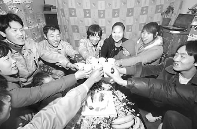 1月26日,在中铁十局沪杭高铁嘉兴轨道板场工作的外来务工人员一同聚会,迎接新春。