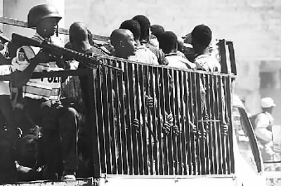 1月29日,在海地首都太子港,参与哄抢电器行的人被押上卡车。当日,太子港发生一起大规模哄抢事件,50多名参与者试图抢劫一家电器行,后被美国士兵和海地警察联合制止。双方发生交火,一名哄抢者在交火中被击毙。新华社记者吴晓凌摄