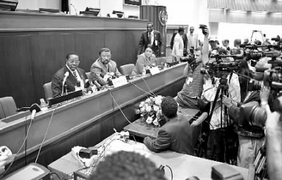 2月2日,在埃塞俄比亚首都亚的斯亚贝巴,新任非洲联盟(非盟)轮值主席、马拉维总统宾古·瓦·穆塔里卡(左一)与非盟委员会主席让·平(左二)出席新闻发布会。当天,第14届非盟首脑会议闭幕,闭幕式后穆塔里卡与让·平召开了联合新闻发布会。新华社发