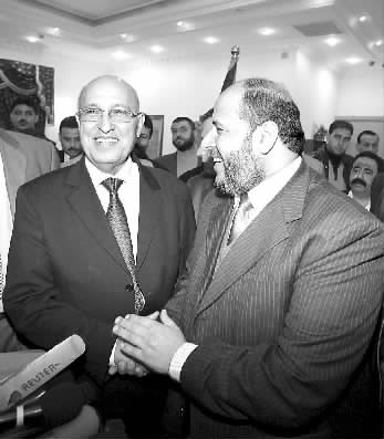 2月3日,巴勒斯坦民族解放运动(法塔赫)中央委员会成员纳比勒·沙阿斯(左)在加沙城与巴勒斯坦伊斯兰抵抗运动(哈马斯)高级领导人哈利勒·海亚会谈后握手。纳比勒·沙阿斯当天呼吁哈马斯尽快签署巴内部和解协议。自哈马斯于2007年6月通过武力从法塔赫手中夺取加沙地带的控制权后,沙阿斯是首位造访这里的法塔赫高级官员。新华社发