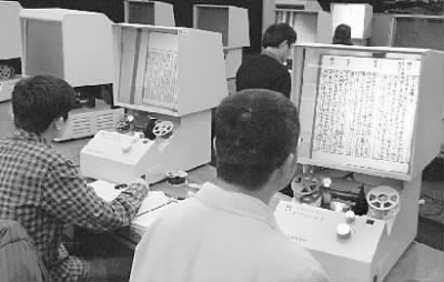 (本文图片 上/读者在国家图书馆善本阅览室的缩微胶片阅读机上读古籍 下/珍贵古籍只能放到特制的书架上阅读 摄影/谌强 本报记者谌强)