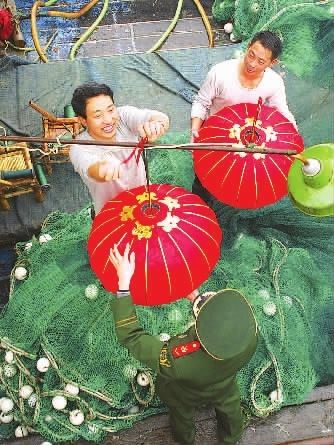农历小年,浙江公安边防总队海警二支队官兵纷纷走上船头开展送新年活动。为渔民们心爱的渔船上挂上一只只大红灯笼,庆祝一年的丰收,共同迎接新年的到来。