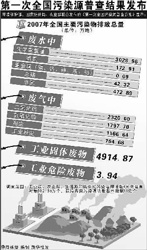 一是查实了全国主要污染物排放总量。普查首次将农业源、县级政府所在地以外全部城镇的生活源以及垃圾处理厂的渗滤液等纳入调查范围,更加客观真实地反映了各类污染源主要污染物排放情况。根据普查结果,2007年全国主要污染物排放总量:废水中化学需氧量为3028.96万吨,氨氮为172.91万吨,重金属0.09万吨,总磷为42.32万吨,总氮为472.89万吨;废气中二氧化硫为2320.00万吨,氮氧化物为1797.70万吨,烟尘为1166.64万吨,工业粉尘为764.68万吨;工业固体废物为4914.87万吨;工业危险废物为3.94万吨。