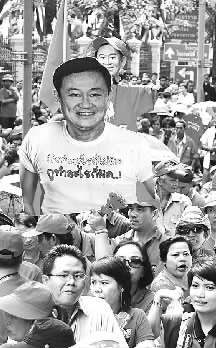 2月10日,在泰国首都曼谷的泰国国家警察局外,泰国民间政治团体反独裁民主联盟(反独联)的支持者“红衫军”高举前总理他信的头像参加集会。当天,反独联组织1000多名“红衫军”在泰国国家警察局外集会,要求加快起诉带领示威者占领泰国总理府和封锁曼谷两大机场的人民民主联盟(民盟)领导人。新华社发(塔纳摄)