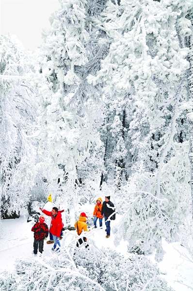 2月16日,游客正在江西庐山花径景区欣赏雾凇和雪凇景观。今年春节期间,受北方冷空气影响,庐山最低气温达零下8摄氏度。庐山多次出现降雪天气,壮观的雾凇和雪凇交相辉映,把庐山装扮得分外妖娆,吸引了大量中外游客。新华社发