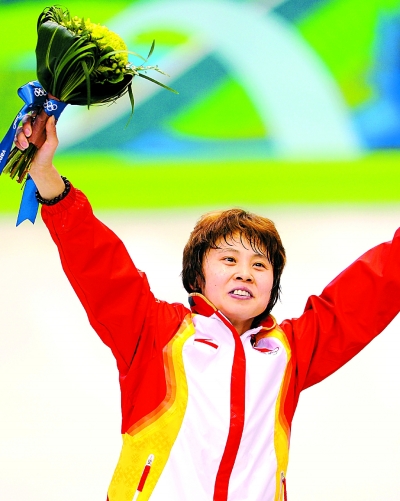 | 2月17日,中国选手王濛在比赛获胜后庆祝。当日,中国选手王濛在冬奥会短道速滑女子500米决赛中以43秒048的成绩获得金牌。这是中国队在本届冬奥会上获得的第二枚金牌。新华社记者 陈凯摄 |