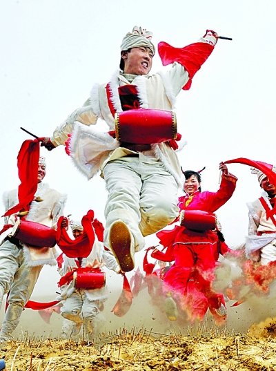 2月26日,陕西省安塞县200多名青年腰鼓手在三道屯移民新村表演激昂豪放的山地腰鼓,喜迎元宵佳节。新华社发
