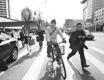 下图:濮存昕委员骑自行车赴会,提倡低碳生活。