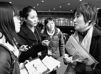 上图:刚刚办完报到手续的吴玉霞委员立刻被记者包围。