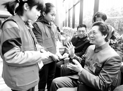 | 3月6日,在北京国际饭店教育界委员驻地,来自天津今晚报的小记者,就目前教育界出现的浮躁之风,向河南大学校长娄源功委员提问。本报记者 高腾摄 |