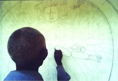 在北京798艺术区,不久前一个以《唐卡》为题的展览上,一幅报纸大小的唐卡标价为4800元。而1996年在西藏扎什伦布寺,这样一幅唐卡仅要百十元,我一口气买了好几幅送亲朋,其中的绿度母为最爱。循着对唐卡的热爱,我还专程到青海省同仁县采访,这里是藏传佛教文化热贡艺术之乡,夏吾才让为其代表人物之一,他一边提笔用力勾勒画稿,一边认真地说:“好唐卡要有精神。”