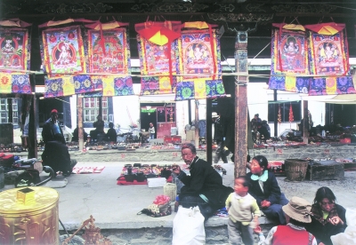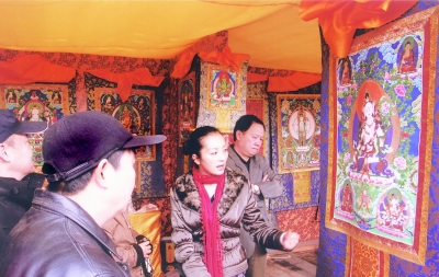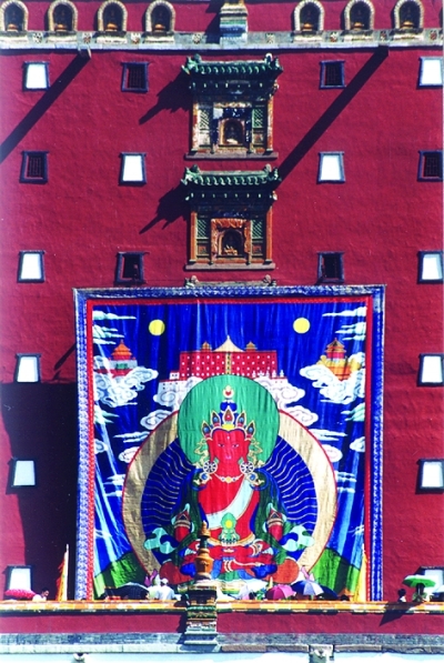 在藏历年二月三十日的西藏赛宝法会上,布达拉宫专门辟有赛佛台,上悬稀世珍品巨型唐卡,其壮观场景令人过眼难忘,仿佛神韵惠及众生,展示铺天盖地唐卡的大山也随之注入了新的活力。