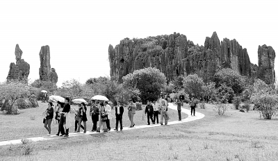 | 4月1日,游客在乃古石林游览。当日,云南石林世界自然遗产展示地乃古石林正式开园迎客。乃古石林位于石林景区北部,距大小石林景区8公里,面积约30平方公里,是云南石林世界自然遗产的核心区。2006年,因申报世界自然遗产,乃古石林进行了为期4年的封园环境整治和生态修复。目前,乃古石林已具备了一流的游客接待设施和游览条件,有5条游览线路供游客选择。 新华社记者 蔺以光摄 |