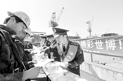 | 日前,浙江舟山边防检查站组织了三支涉外法律宣传服务队,深入口岸8个责任区89个对外开放点开展“宣传边检法律,迎接精彩世博”活动,这是他们向舟山港内2000多名外籍船员宣传边防检查法律法规。 本报通讯员 叶芳摄 |