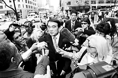 | 4月8日,在位于美国纽约的英国常驻联合国代表团驻地外,中国常驻联合国代表李保东(中)在磋商结束后接受媒体采访。美国、法国、中国、俄罗斯、英国和德国六国常驻联合国的代表当日下午在纽约举行会谈,讨论伊朗核问题。 新华社记者 申宏摄 |